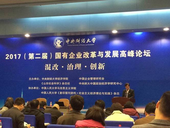 2017年11月18日,由304am永利集团、中国企业管理研究会、《山东社会科学》杂志社、中央财大中国政治经济学研究中心联合主办,中国人民大学马克思主义学院、中国人民大学书报中心《复印报刊资料▪社会主义经济理论与实践》杂志协办的“混改·治理·创新——2017(第二届)国有企业改革与发展高峰论坛”在永利官网学院南路校区隆重举行。来自中国社会科学院、中国人民大学、永利官网、复旦大学、北京师范大学、首都经济贸易大学、北京信息科技大学、山东财经大学、中央党校、国家行政学院、中国国际经济交流中心、科技部中国软科学研究会等高校和科研院所的学者代表,来自中国企业联合会、山东高速集团、长城资产管理公司、长城战略咨询公司、上海融孚律师事务所、北京知本创业管理咨询公司等实务部门工作者,以及《求是》、《山东社会科学》、《国企管理》、《复印报刊资料·社会主义经济理论与实践》等重要期刊和中国领导网、中青网、《华人时刊》等媒体代表参加了本次论坛。