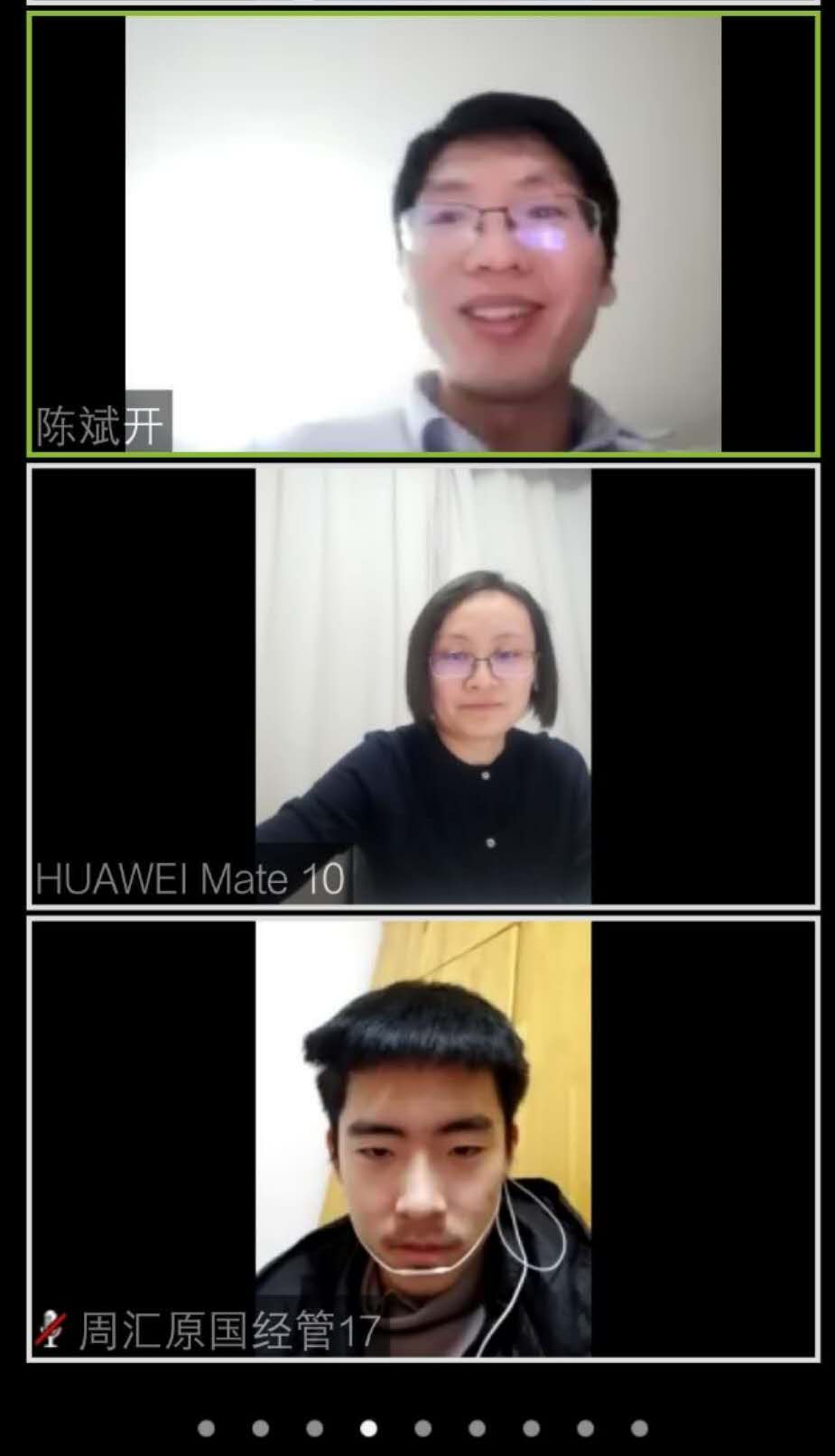 陈斌开经理称赞在鄂同学们所展现出的良好、积极向上的精神状态,感谢大家在疫情最严重最艰苦的地区为疫情防控所作的巨大贡献,表达了学院和老师们对同学们的牵挂,并逐一细致的回答了关于毕业生论文答辩、考研复试安排、就业政策变化和线上学习遇到困难等同学们关心的问题,嘱咐同学们注意保护自己和家人的身心健康,如有余力可以帮助周围更多的人,勉励大家充分利用好在家学习的时间,努力充实自己!